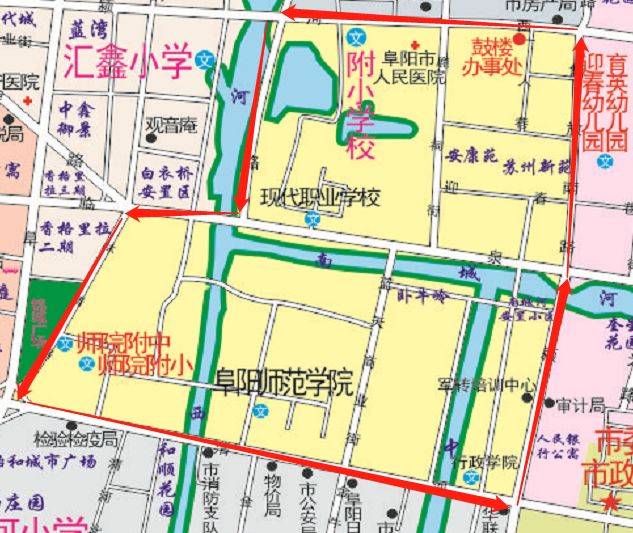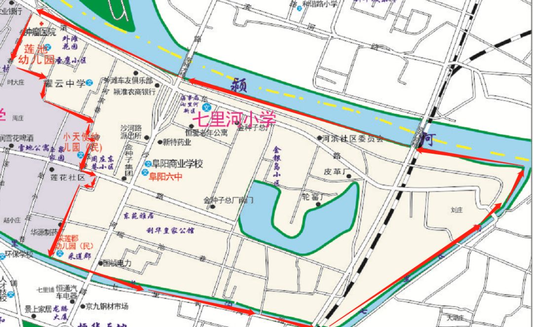 东至汝阴路,南至颍河西路,西至七渔河,北至人民西路。