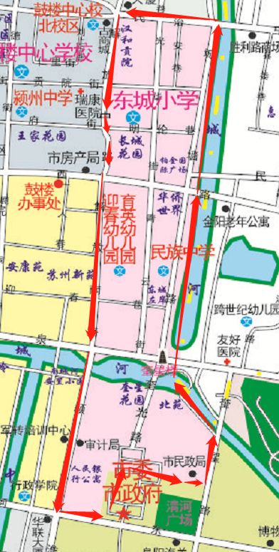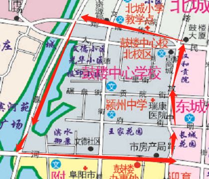东至东城墙路、奎星路,南至清河东路、市民政局(颍州辖区),西至颍淮大道、解放南路、解放中路,北至人民中路。