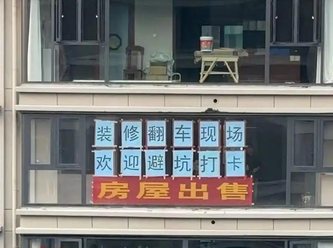 房子窗户上贴着“装修翻车现场,欢迎避坑打卡”的字样。