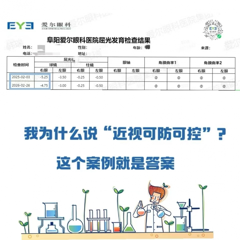 阜阳爱尔眼科医院视光科负责人表示:“儿童青少年近视防控,是一场‘持久战’,更是一场‘精准战’。我们始终坚持‘早发现、早干预、科学控’的原则,通过个性化方案,帮助更多孩子实现‘度数不涨、眼轴稳控’,甚至像这位同学一样,达成眼轴回退的理想效果。”